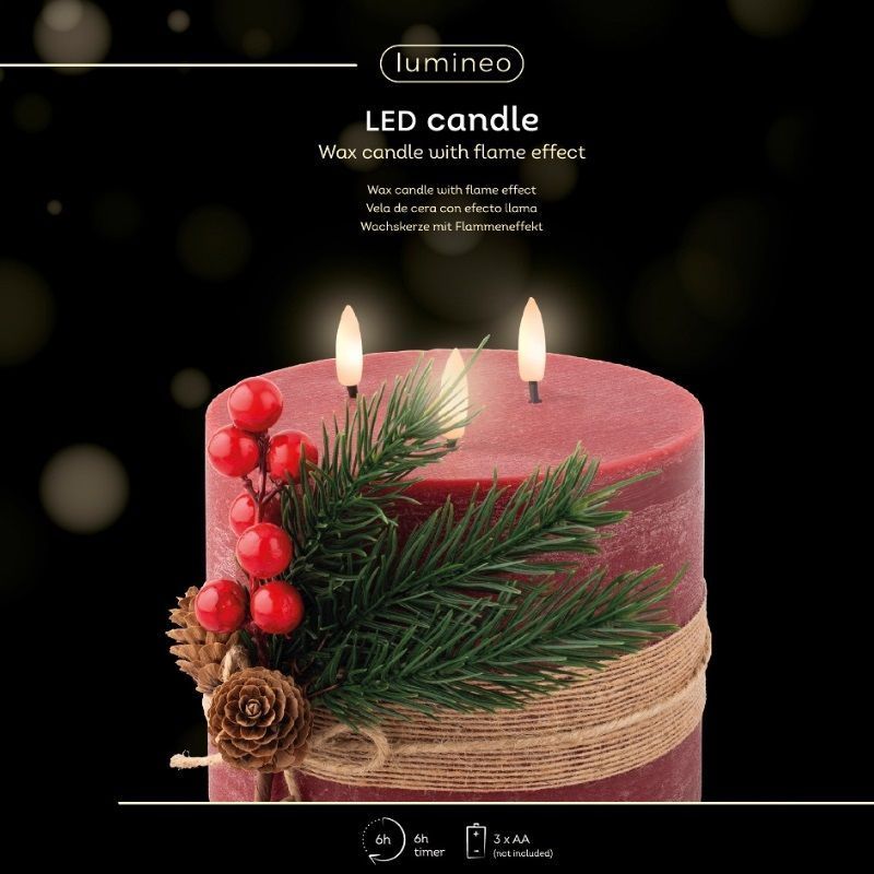 This beautifully crafted 15cm candle is ideal for adding a warm and seasonal touch to your home. This candle combines rich colour with natural accents and a realistic flickering flame, making it a perfect addition to any Christmas decor.